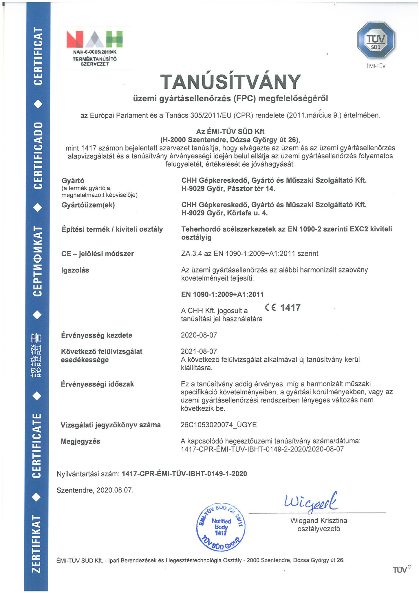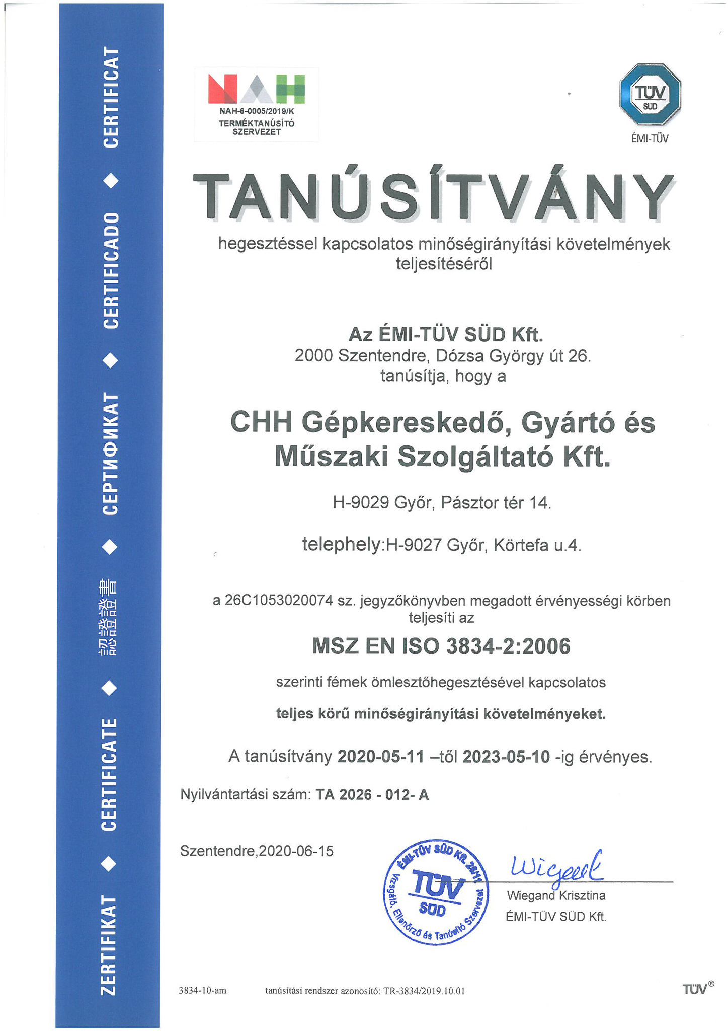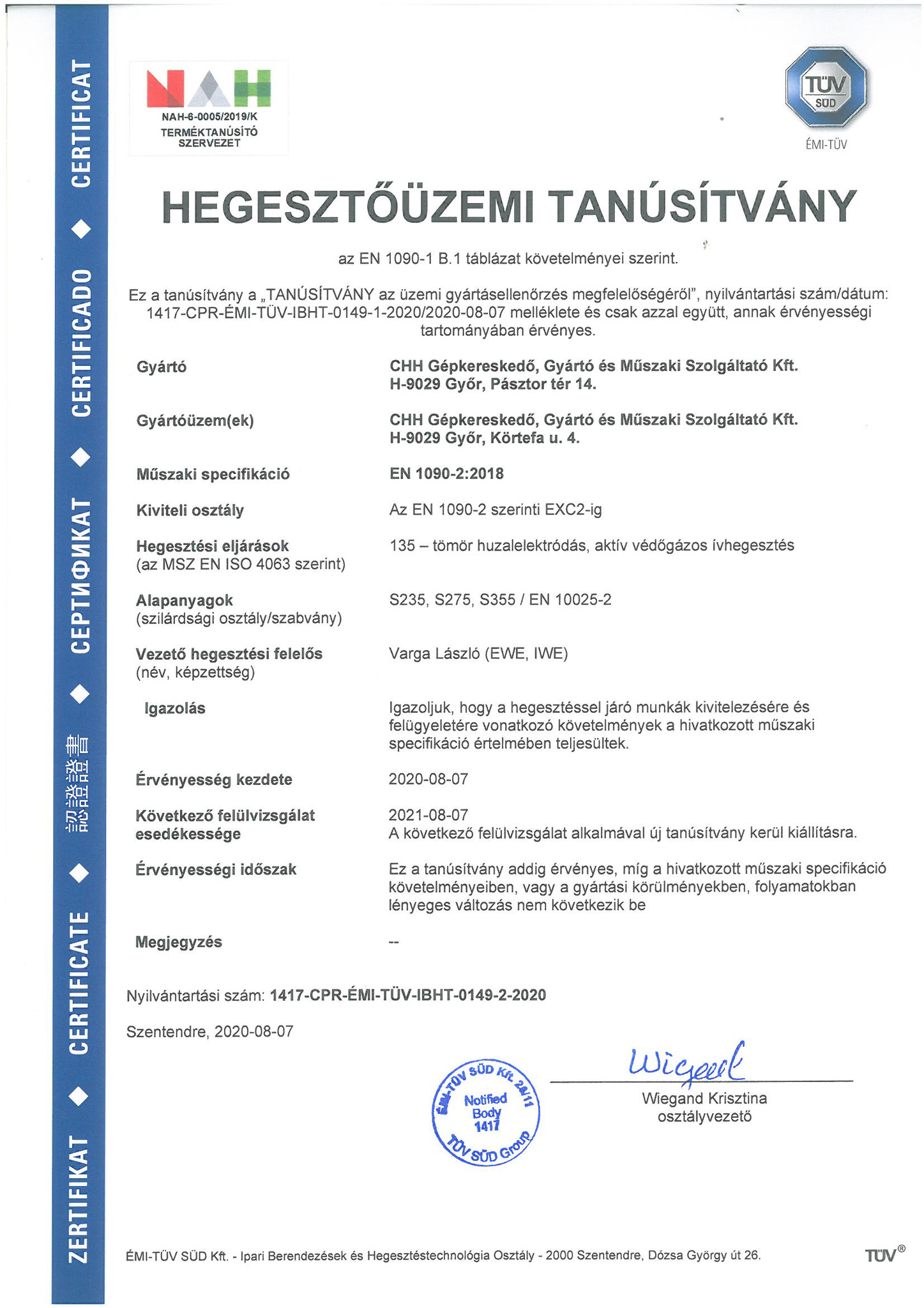 A CHH Műszaki KFT elkötelezett a szakmaiság és a magas minőség mellett. Gyártási színvonalunk emelése érdekében a jövőben ISO irányelvek mentén végezzük gyártási folyamatainkat. Magfeldolgozó technológiát támogató hegesztett acélszerkezetek- és egyéb mezőgazdasági kiegészítők gyártása és szerelése hegesztőüzemünkben MSZ EN ISO 3834:2:2006 szabvány szerint történik. 2020 augusztusában bevezettük az EN ISO 9010-1 gyártásközi minőség tanúsítást. A CHH Műszaki KFT a további piacszerzés érdekében elsősorban a gyártási tevékenység fejlesztését tűzte ki célul. A modern fém megmunkáló üzemünk fejlesztése lehetőséget ad a hosszú távú, stabil, kiszámítható fejlődésre.